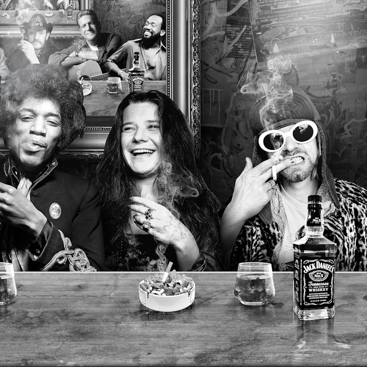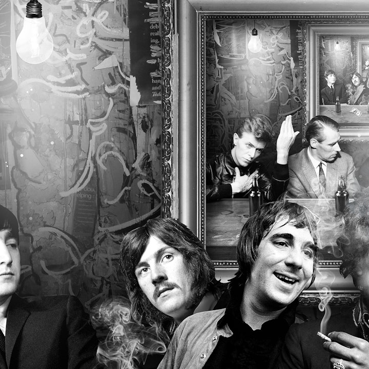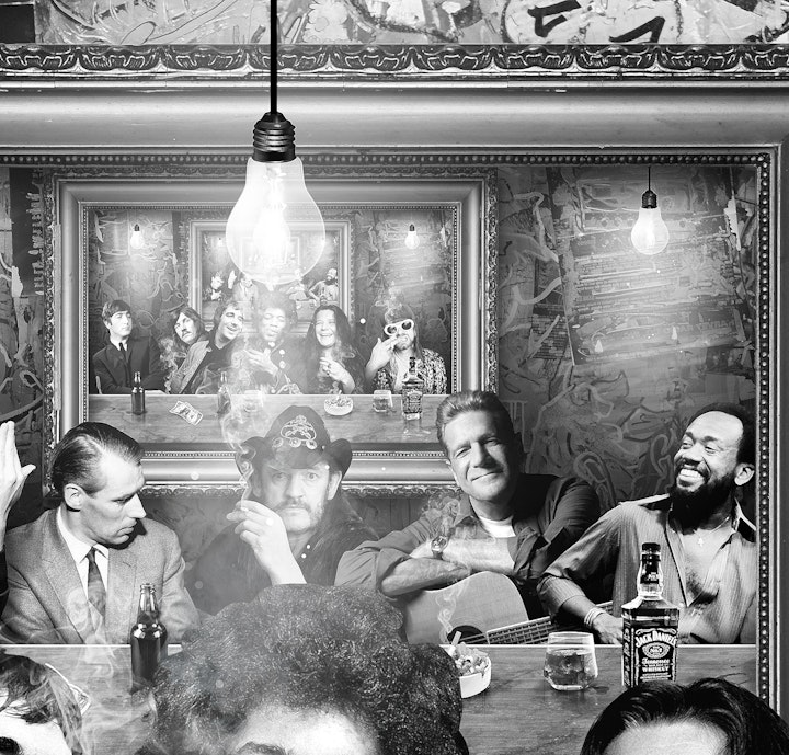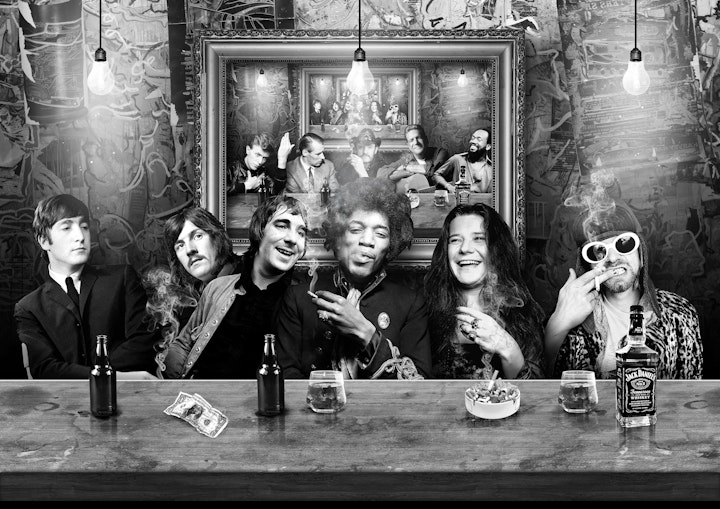 Rock Music Art - Bespoke photographic collage of a clients favourite musicians, in a surreal rock bar as the picture behind is of the same bar but with a different group, and that then switches round in that picture to the original picture. Groups Includes David Bowie, Glen Frey, Lemmy Kilmister, Maurice White, George Martin. Front group includes John Lennon, Jimmy Hendrix, Keith Moon, Kurt Cobain, Janis Joplin, and John Bonham.