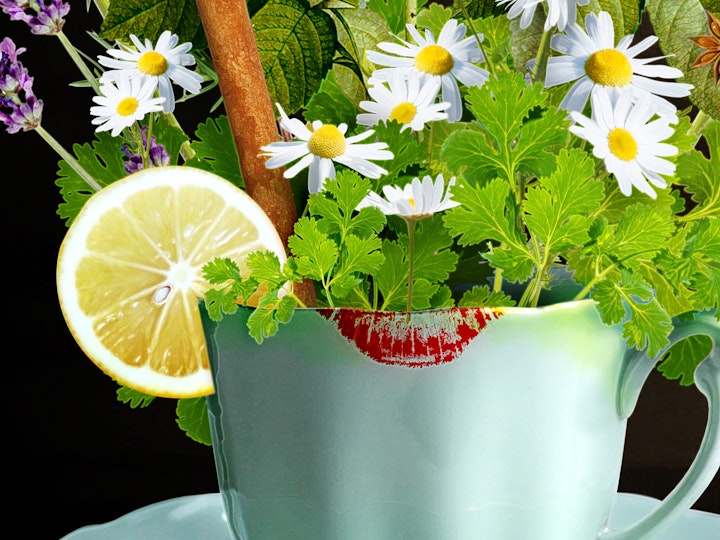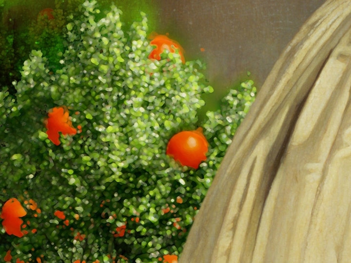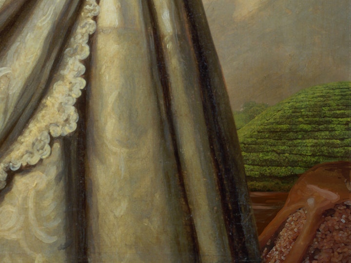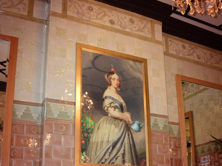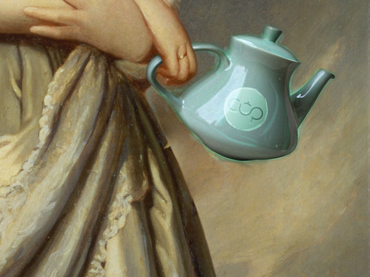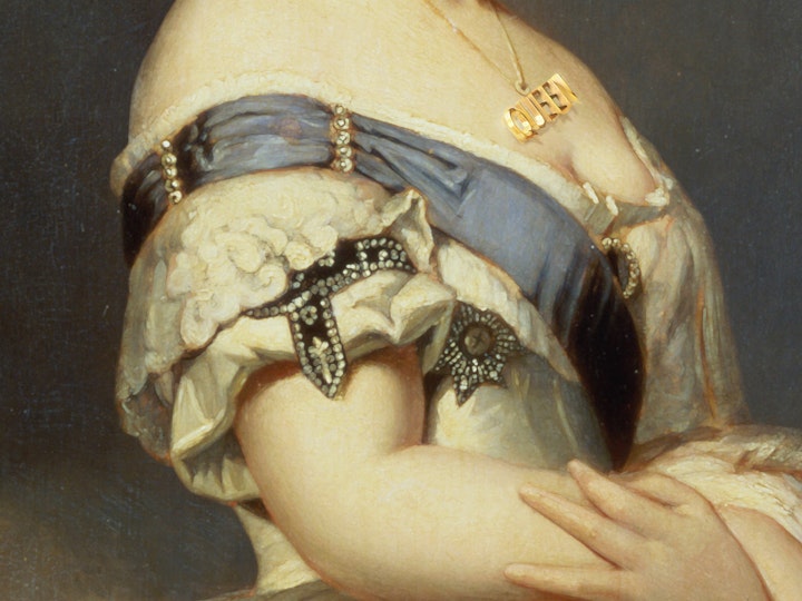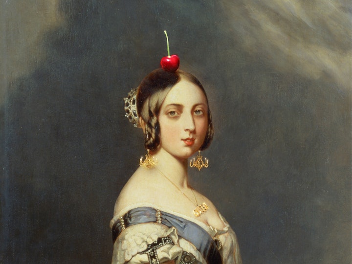 Art 1 - Contemporary modified portrait of a young Queen Victoria, an avid tea drinker in her day, with modern tea and cocktail related elements such as chandelier earrings, dessert hills in the background, fruit trees, a queen word necklace and a cherry.
