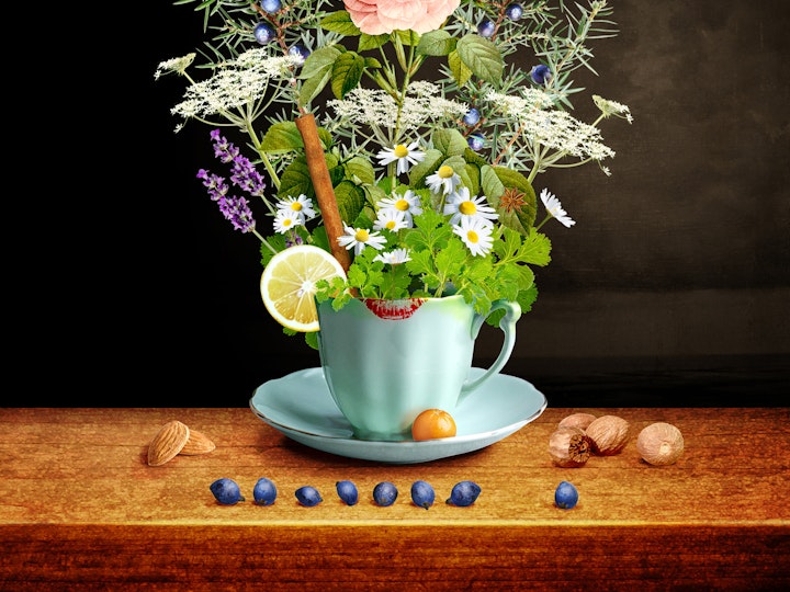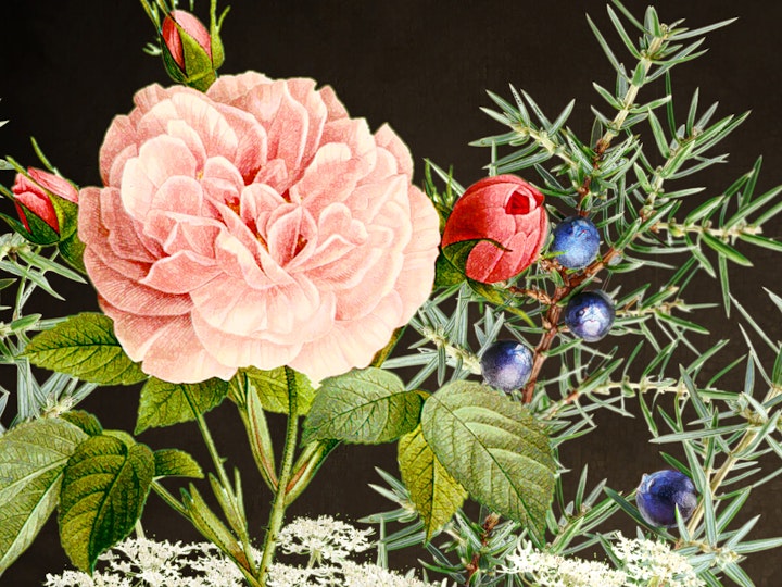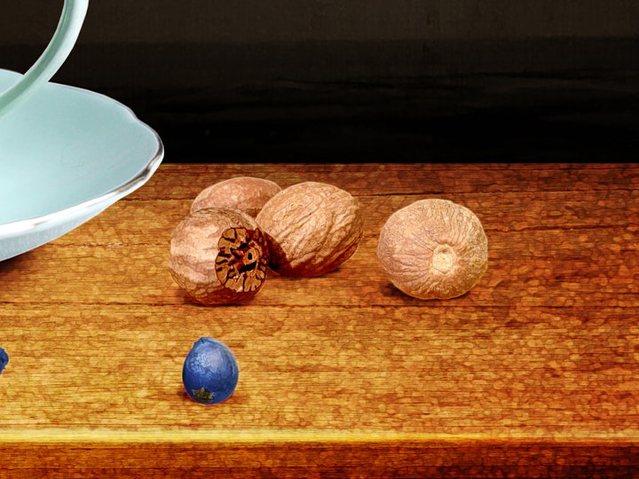 Art 2 - Contemporary botanical/floral still life art containing all the botanical ingredients to make gin such as coriander, lemon, orange, angelica, and 7 + 1 juniper berries at the front spelling out 71, the name of the bar.