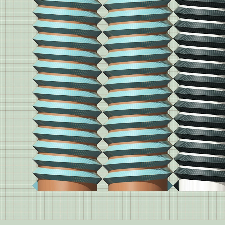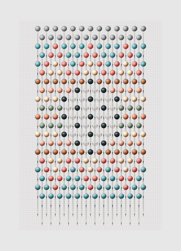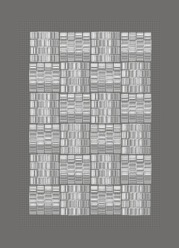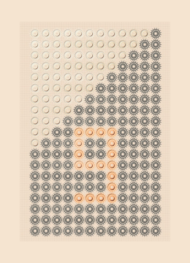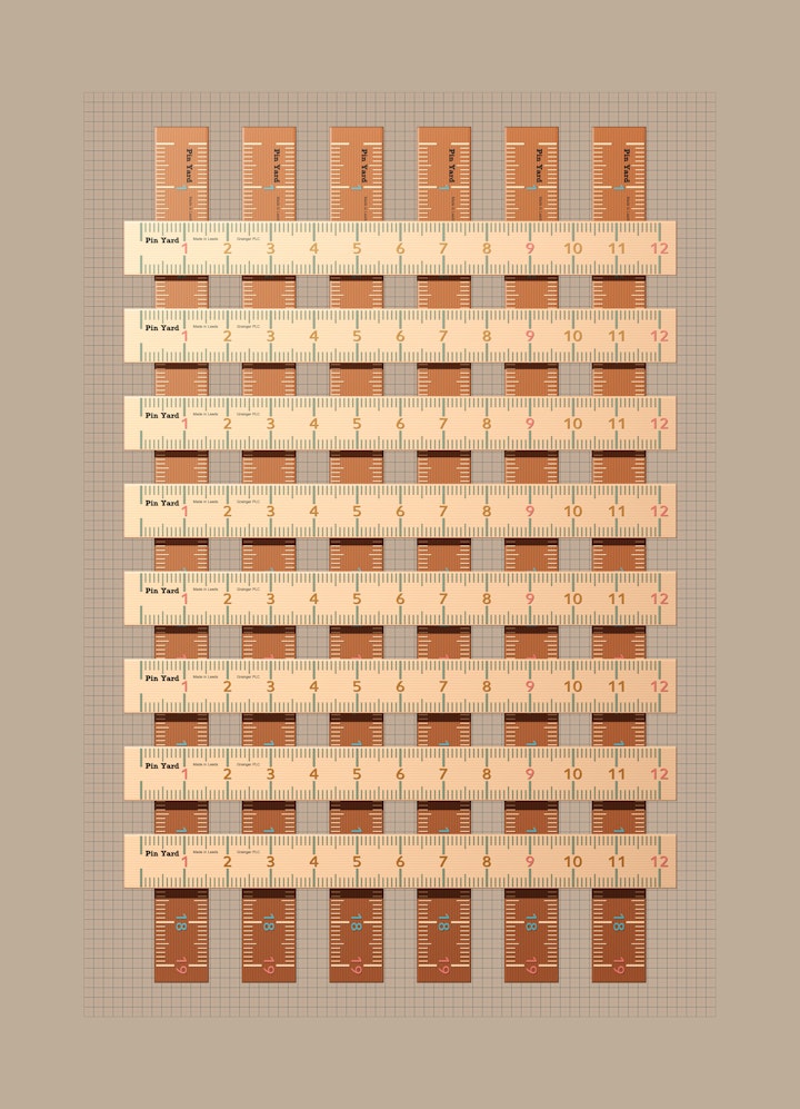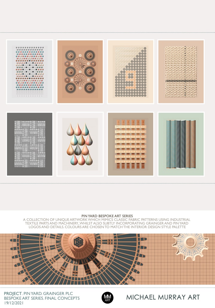 A bespoke art collection of industrial art for the Pin Yard building, a BTR development in Leeds, UK. A collection of unique artwork which mimics classic fabric patterns using industrial textile parts and machinery, to reference the areas history, whilst also subtly incorporating Grainger and Pin Yard logos and details. Colours are chosen to match the interior design style palette.