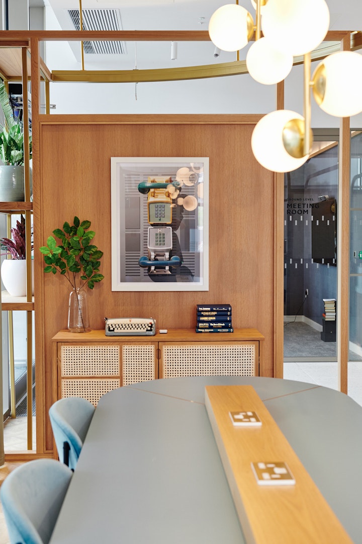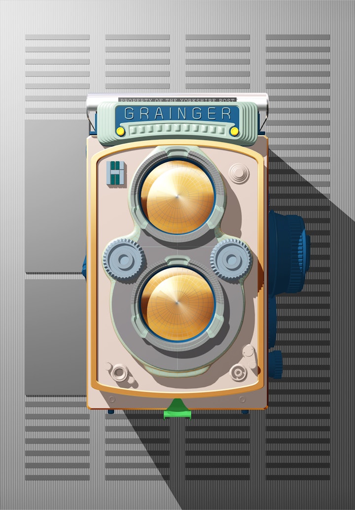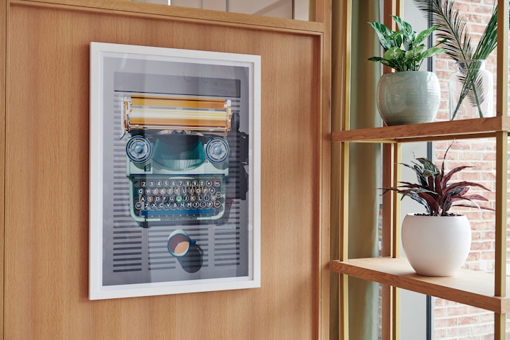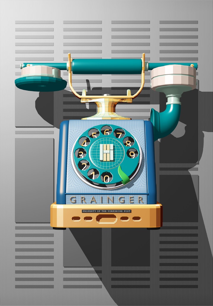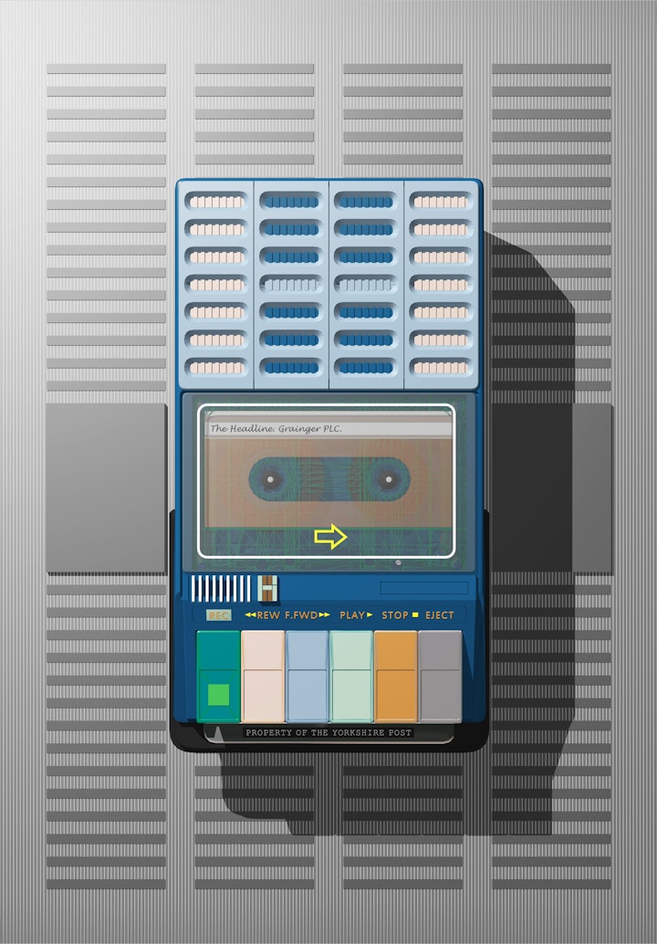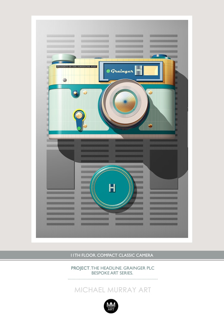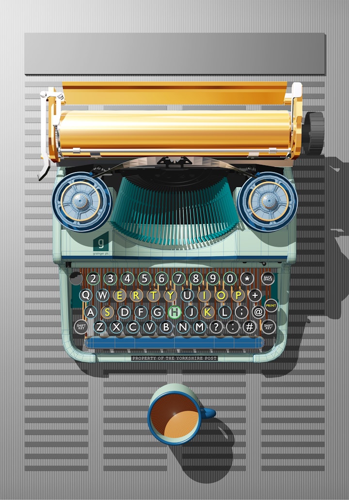 Interesting features - Each piece of art subtley incorporates design elements such as the Headline logo H but in 3d, Grainger corporate logos, the date of the first paper from the Yorkshire post (1866), the founding date of Grainger (1912), "Property of the Yorkshire Post" stickers in a typed style, and the Yorkshire post is also spelled out on the typewriter keys. The designs also match the colours of the interior design palette, plus the fonts, paper grid design for the background, and design elements, mimic the graphic design documents.